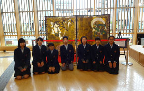 2月22日(月)、上京区役所の一階ロビーには立止まる来場者の姿が多数みられた。足を止めた来場者の目線の先には、上京中学校美術部が夏休みを丸々費やして作成した『風神雷神図』の屏風絵が飾られていた。