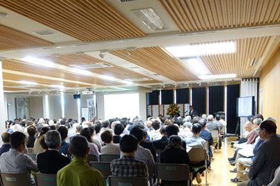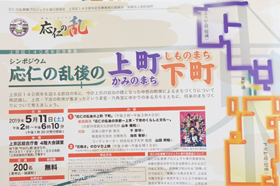 令和元年5月11日、上京区総合庁舎4階にて、シンポジウム「応仁の乱後の『上町下町』」が開催されました。改元の直後、なにかしらとても晴れやかな雰囲気が感じられる会場は、お話を聞きに来られた区民の方々で満員になりました。