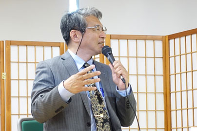 門川京都市長、応仁の乱 東陣プロジェクト実行委員会の細尾会長のご挨拶のあと、まず最初に公益財団法人京都市埋蔵文化財研究所の山本雅和氏による基調講演「応仁の乱後の京都―上京・下京のくらしと文化―」が始まりました。
