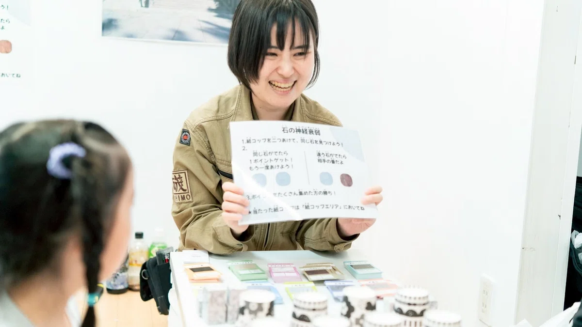 とはいえ、石は重くて固く、扱いを間違えれば危険もあります。普段の仕事も墓石や建築工事が中心で、体験型イベントには不向き。何をすれば良いのか大変悩みました。そこで考えついたのが『石の神経衰弱』です。10種類の石を直径3cmにくり抜き、紙コップに隠して当ててもらう仕組みで、参加者には石の種類や特徴を紹介したカードをプレゼントしました。