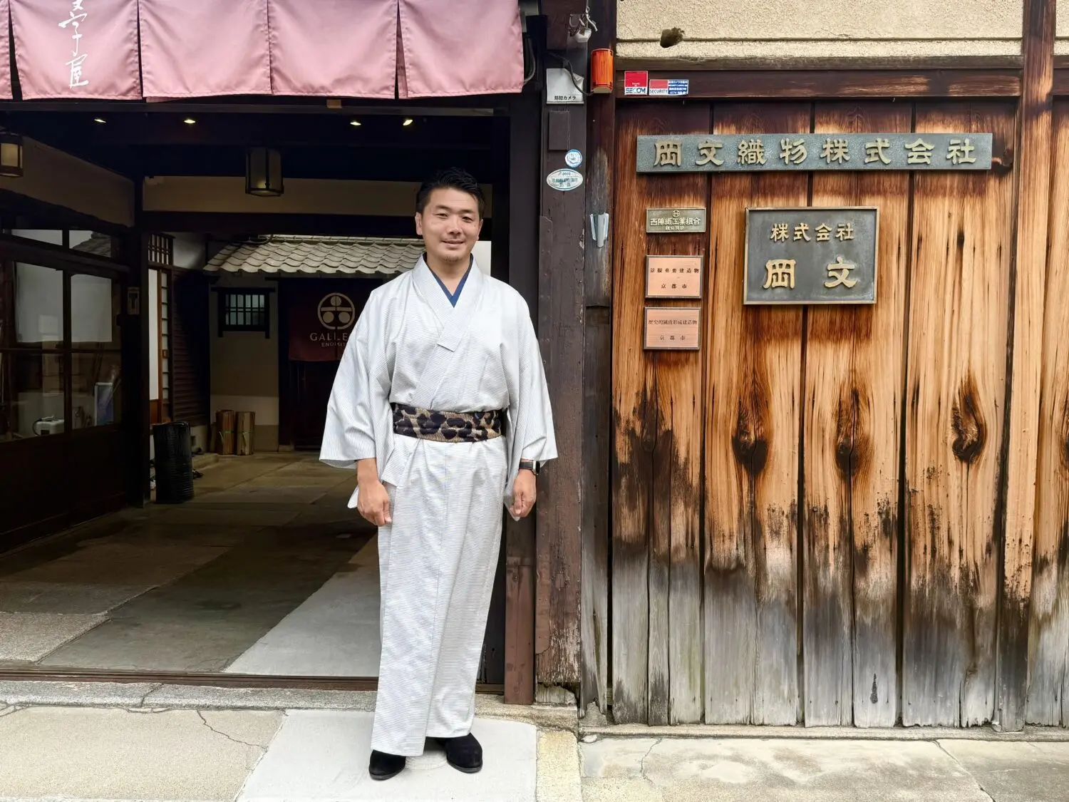 1984年、京都市北区生まれ。京都西陣織製造「六文字屋」・岡文織物株式会社 代表取締役社長。15代目のアトツギ。