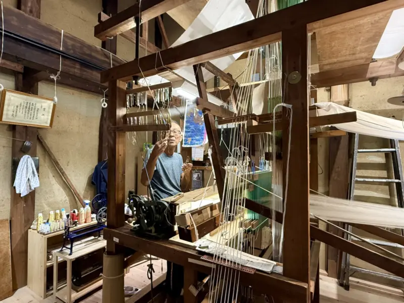ガラス越しに自動織機の稼働を間近に見られ、また別の部屋には職人が手機で織る姿がある。蔵を改装した上質な空間は、西陣の“織の鼓動”を感じさせる場所でした。
