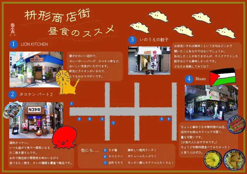 出町桝形商店街ではお昼ご飯を食べるお店をたくさんある中から選ぶことができるので、私たちは参加者に配るしおりに、おすすめの飲食店を記載することにしました。
